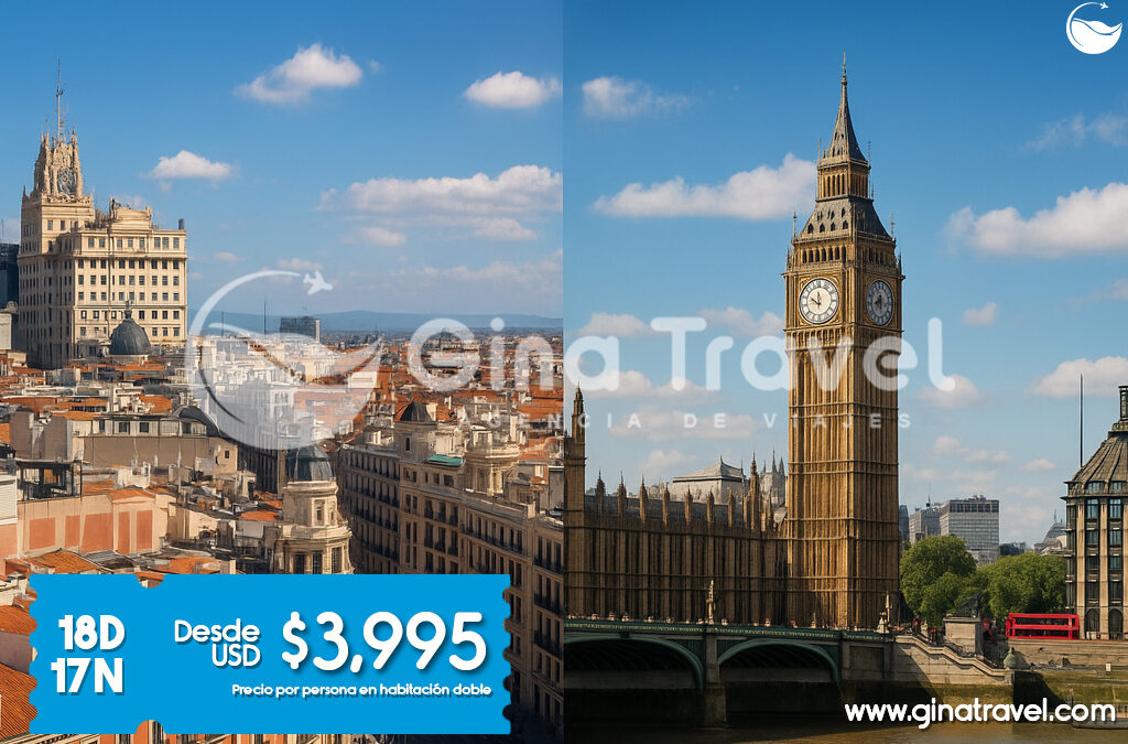 Explora las bellezas de Europa con nuestro paquete de Londres a Madrid. Descubre historia, cultura y paisajes únicos en un viaje inolvidable. Vive experiencias auténticas en cada destino y disfruta de un recorrido diseñado para ti. ¡Reserva ahora y haz realidad tu aventura europea!. COD: CTM