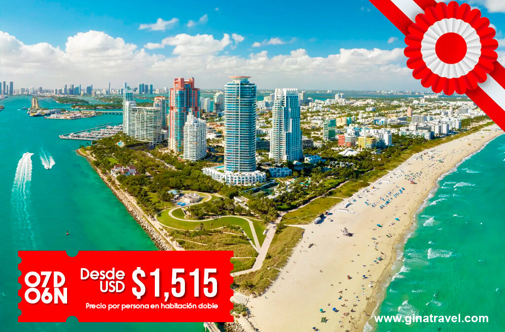 ¡Celebra Fiestas Patrias en Miami! Disfruta de una experiencia inolvidable con nuestros paquetes exclusivos. Vuelos, hotel, traslados y actividades para vivir la emoción de la celebración peruana en la vibrante Miami. ¡Reserva ahora y festeja con orgullo!. COD: AG